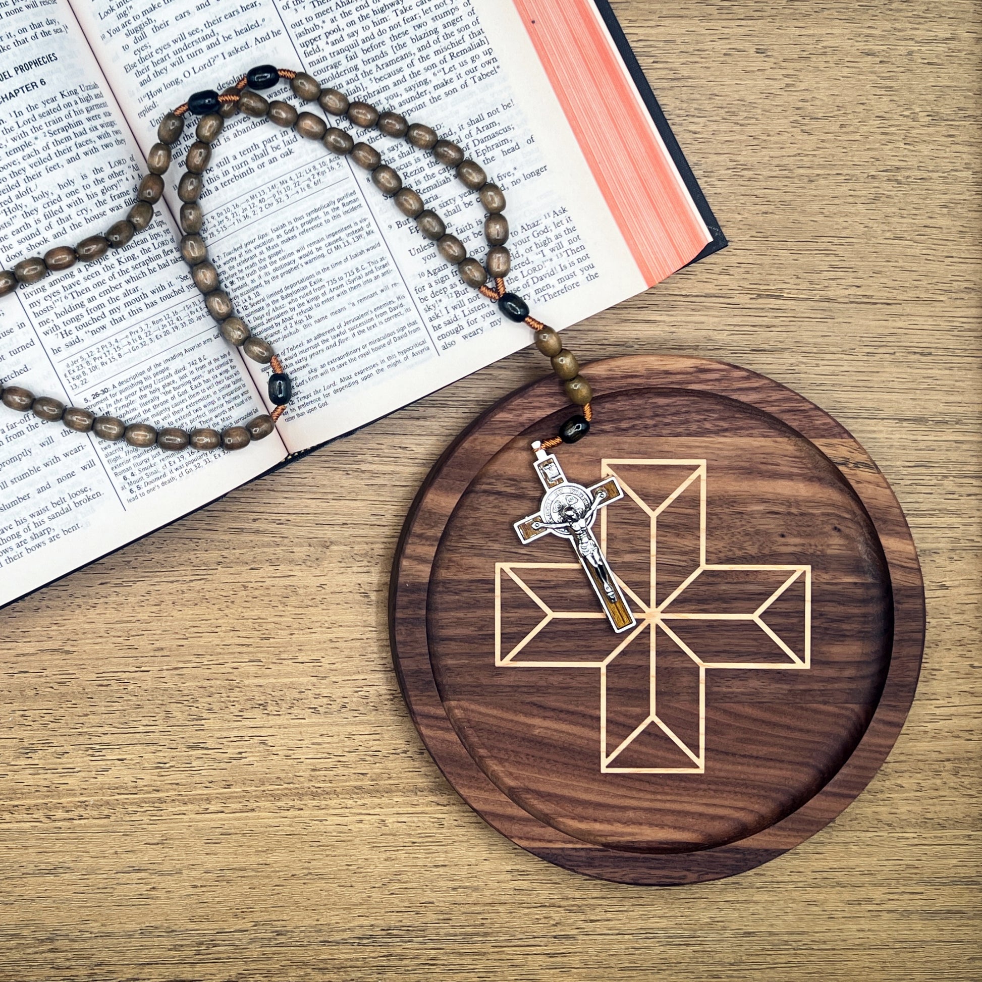 This elegant catchall tray features a beautifully inlaid geometric cross design at its center, blending spiritual symbolism with practical style. Ideal for organizing keys, jewelry, or small essentials like a rosary, it adds a touch of faith and sophistication to any tabletop, desk or dresser. Perfect for gifting or enhancing your home with meaningful decor.