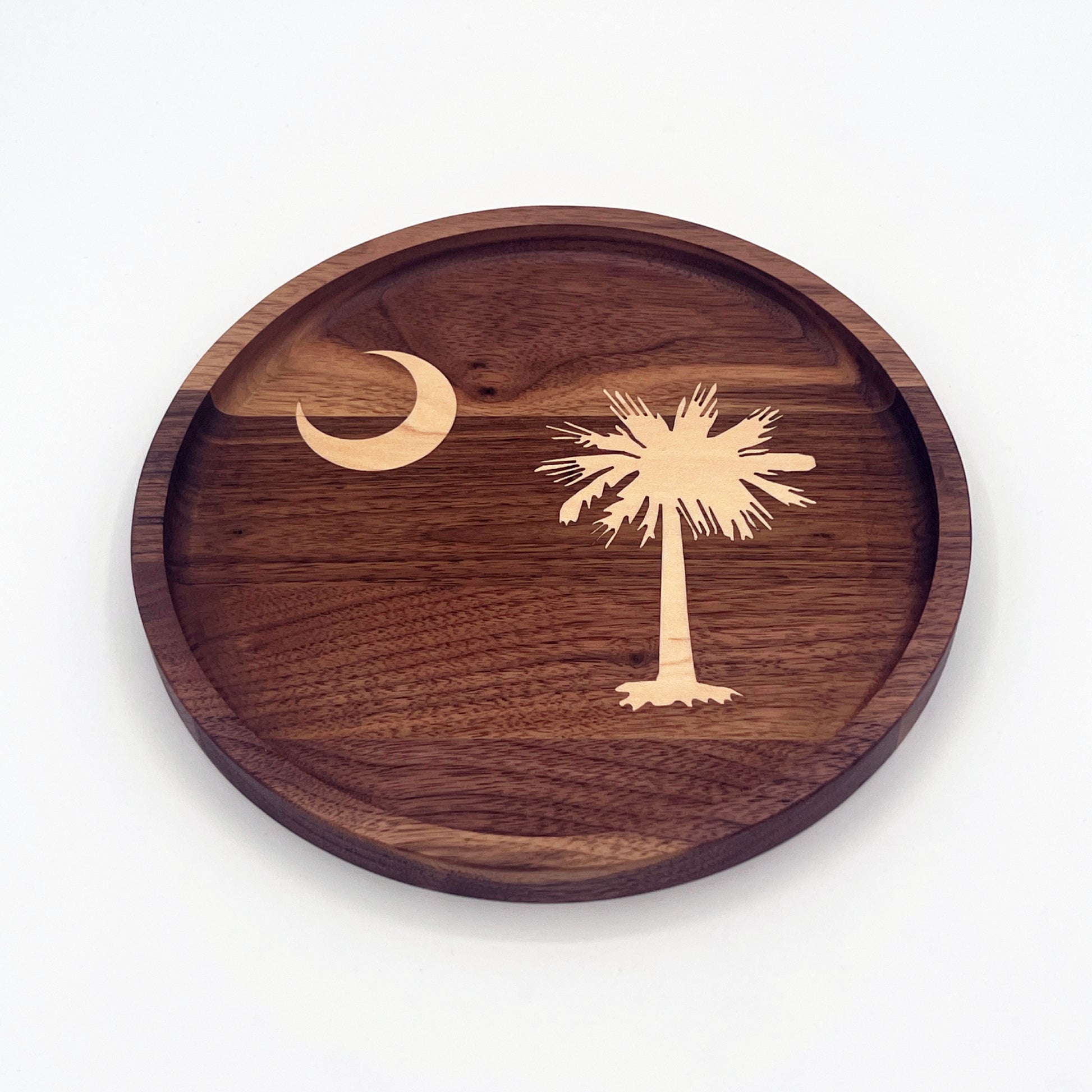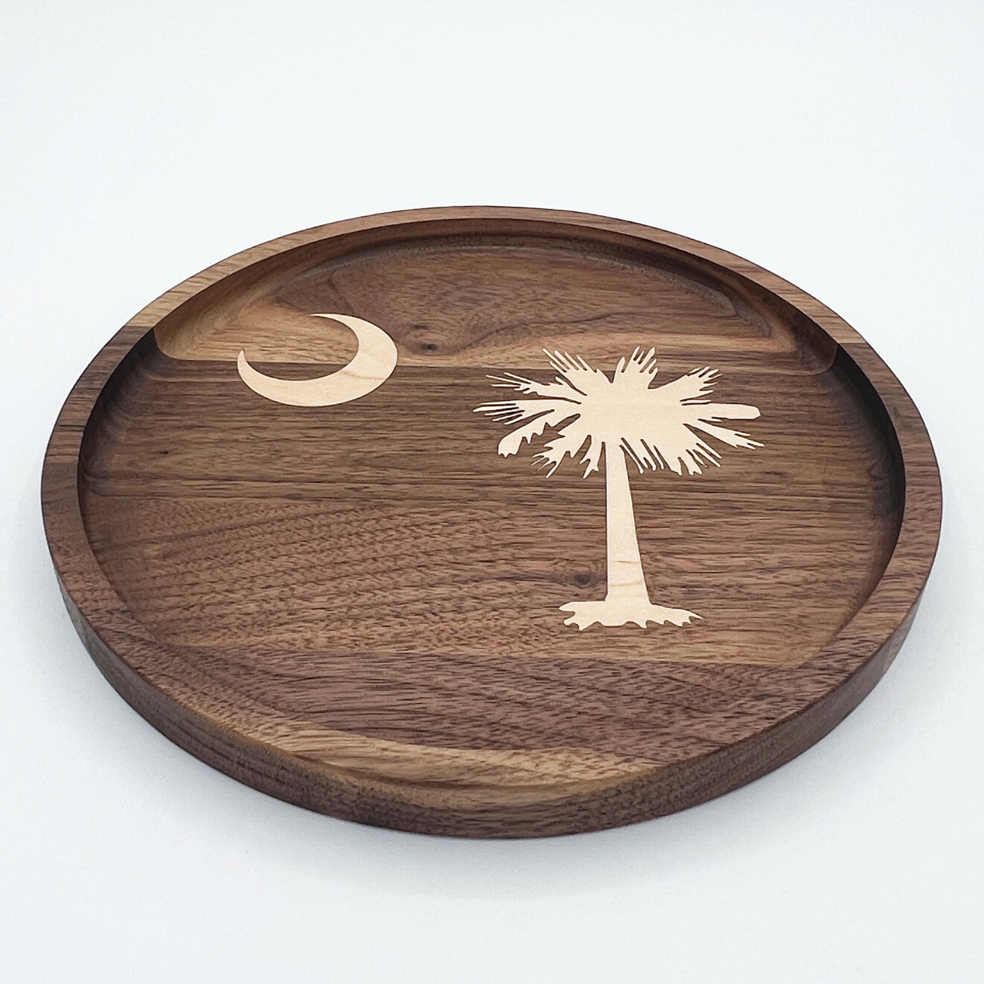 This black walnut catchall tray features the palmetto and crescent moon inlaid with maple, and is perfect for organizing keys, jewelry, or other essentials on a dresser or desk.